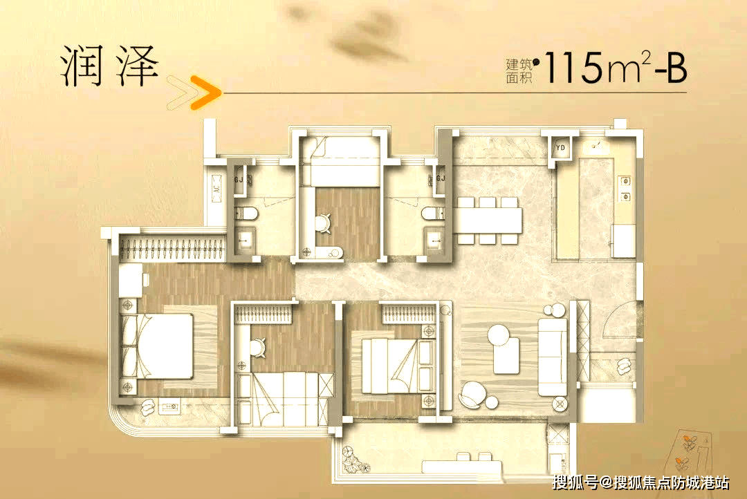 115㎡四房两厅两卫,主打改善体验,总价520万起,五开间朝南且南北对流,LDKG一体化设计打造超60㎡家庭核心区,部分卧室可打通,满足多孩家庭或居家办公需求,是改善型家庭的首选户型。